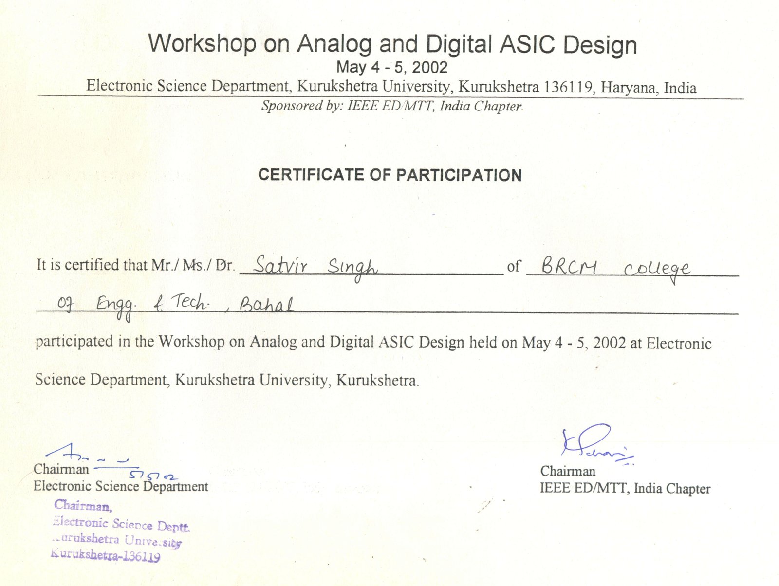 | 5. | Analog and Digital ASIC Design | 2-Day Workshop | Electronic Sc. Department, KU Kurukshetra, HR | May, 04-05 2002 |  |