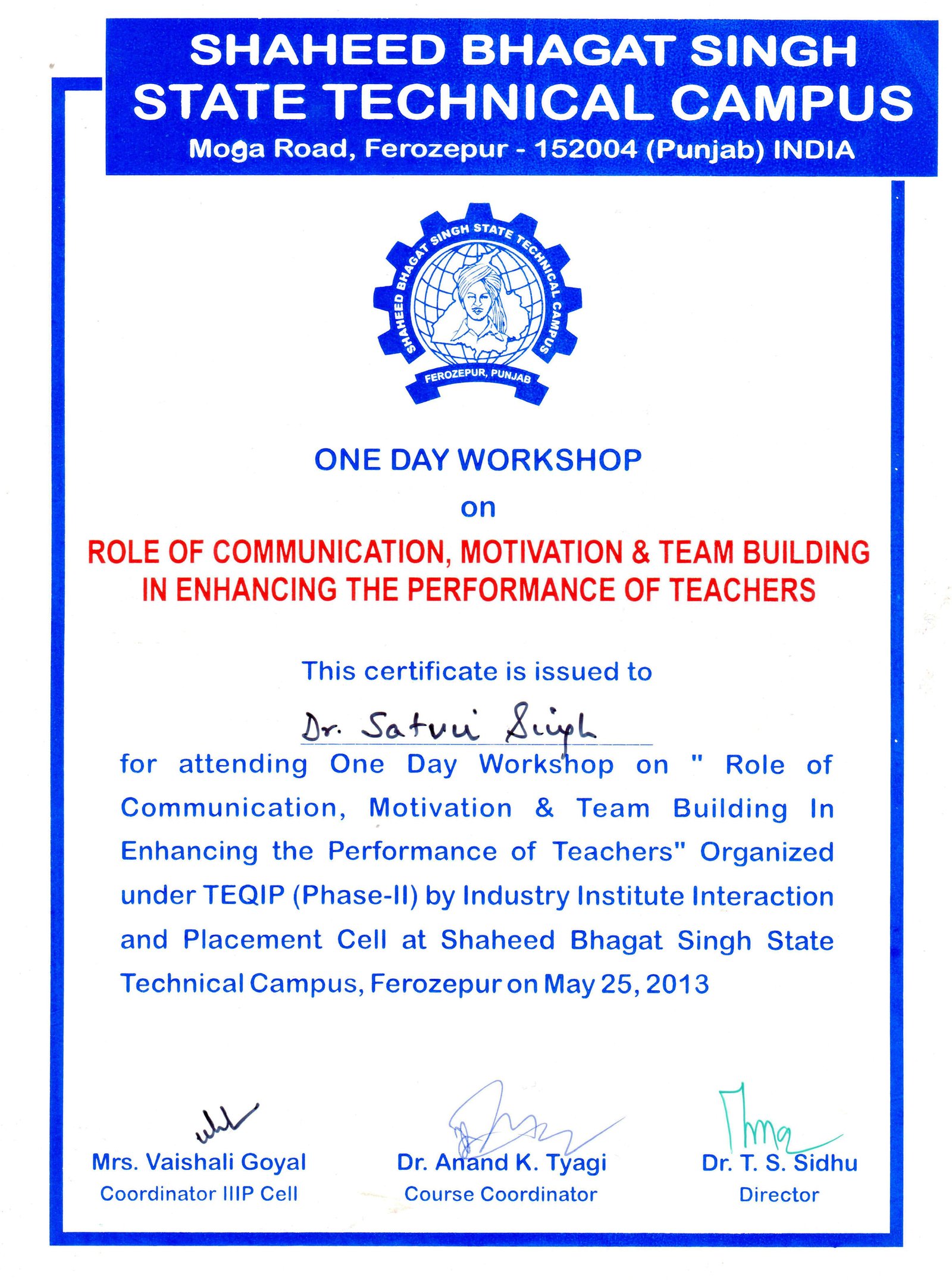 | 2. | Role of Communication, Motivation & Team Building in Enhancing the Performance of Teachers | 1-Day TEQIP Sponsored Workshop | SBS College Engg. & Tech., Ferozepur, PB | May, 25 2013 |  |