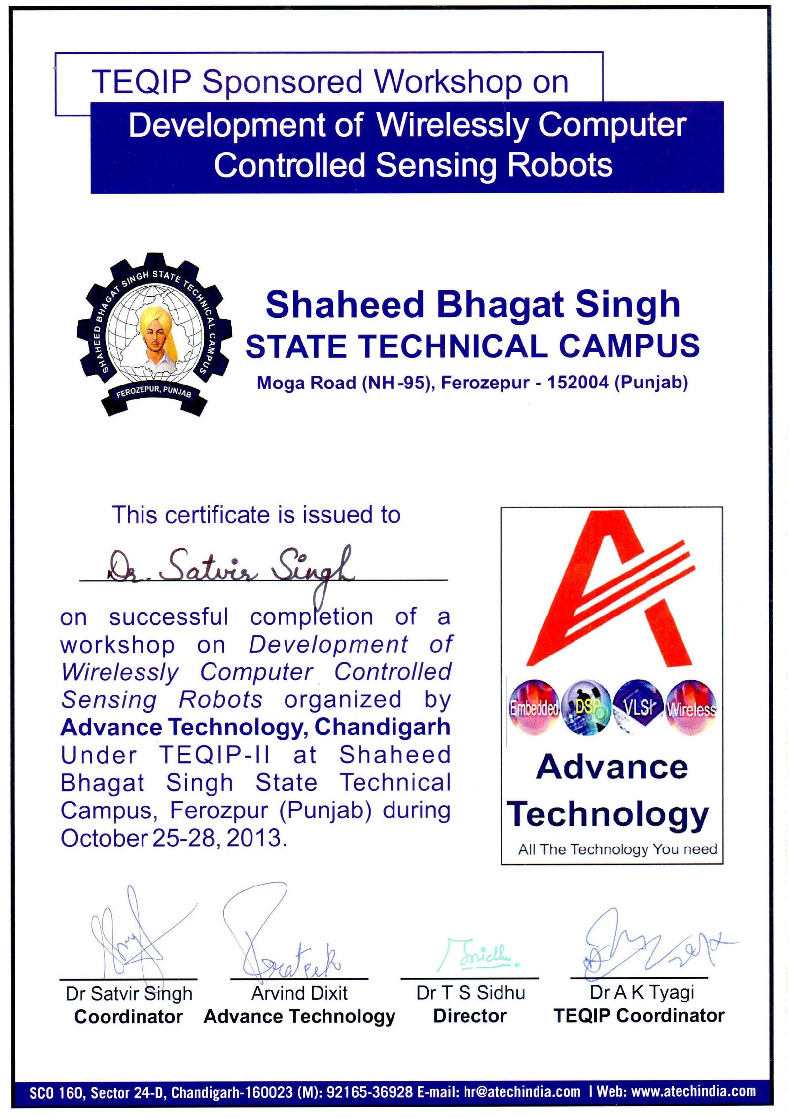 | 4. | Development of Wirelessly Computer Controlled Sensing Robots | 4-Day TEQIP Sponsored Workshop | SBS College Engg. & Tech., Ferozepur, PB | Oct, 25-28 2013 |  |