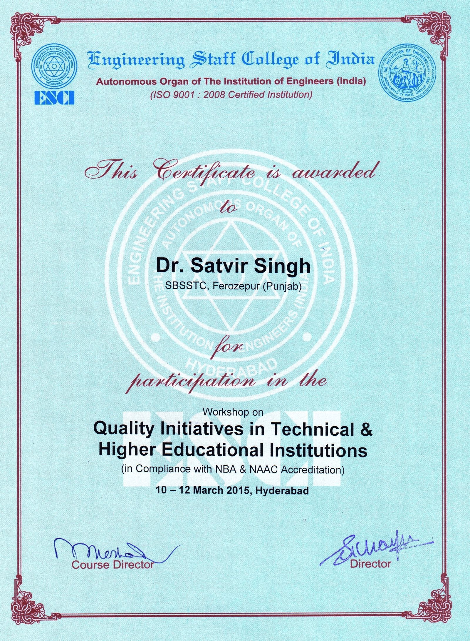 | 1. | Quality Initiatives in Technical & Higher Educational Institutions | 3-Day Workshop | ESCI, Hyderabad, Talengana | Mar, 10-12 2015 |  |
