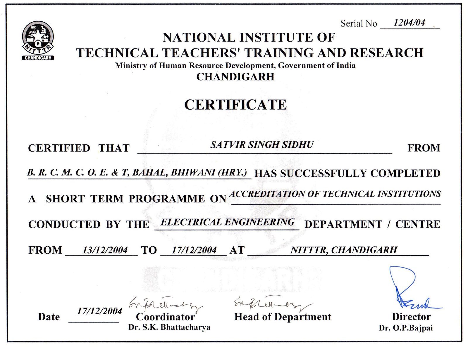 | 15. | Accreditation of Technical Institutions | Short Term Course | NITTTR, Chandigarh | Dec, 13-17 2004 |  |