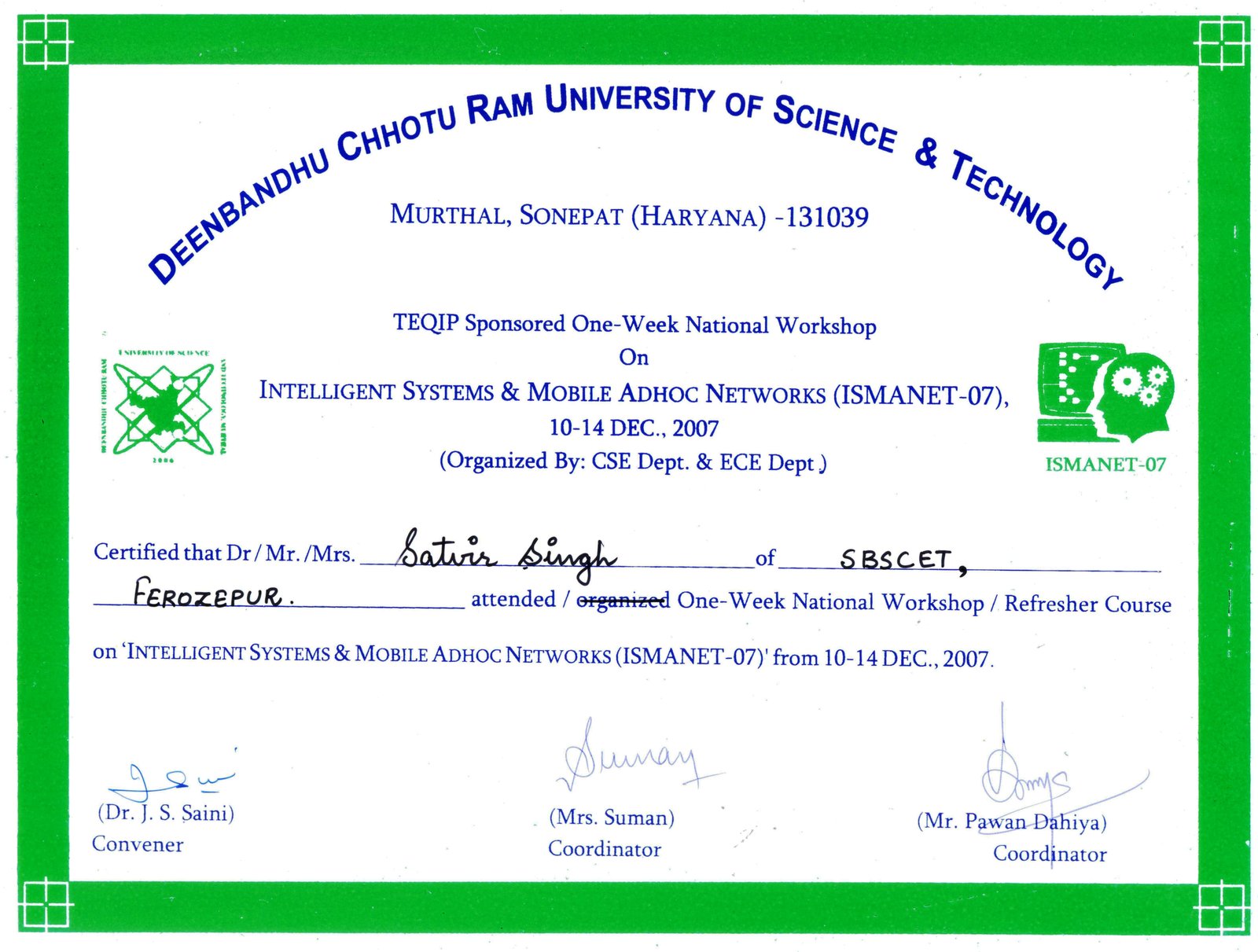 | 14. | Intelligent Systems & Mobile Adhoc Networks | TEQIP Sponsored STC | DCRUST, Murthal, Sonepat, Haryana | Dec, 10-14 2007 |  |