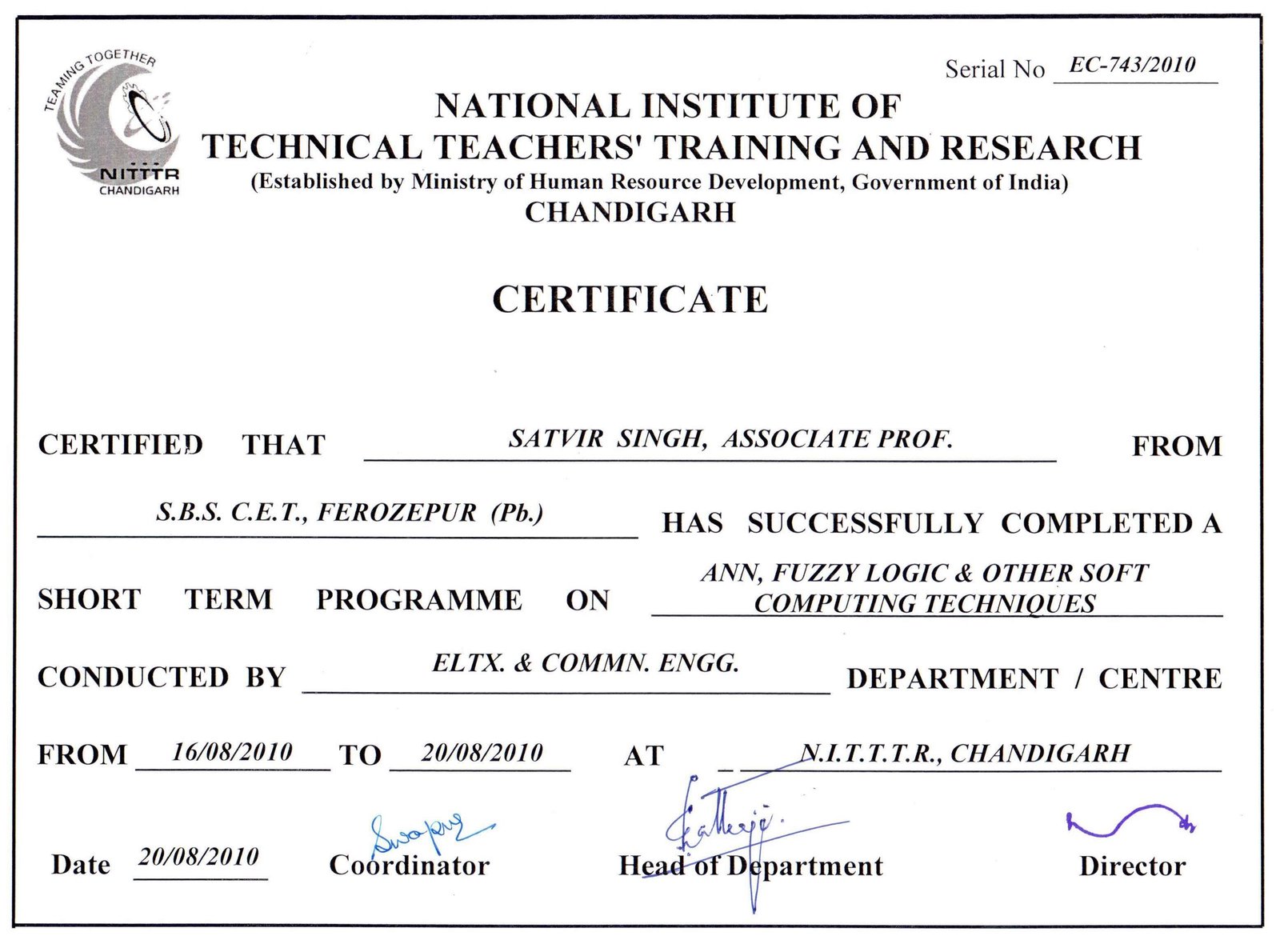 | 13. | ANN, Fuzzy Logic & Other Softcomputing Techniques | Short Term Course | NITTTR, Chandigarh | Aug, 16-20 2010 |  |