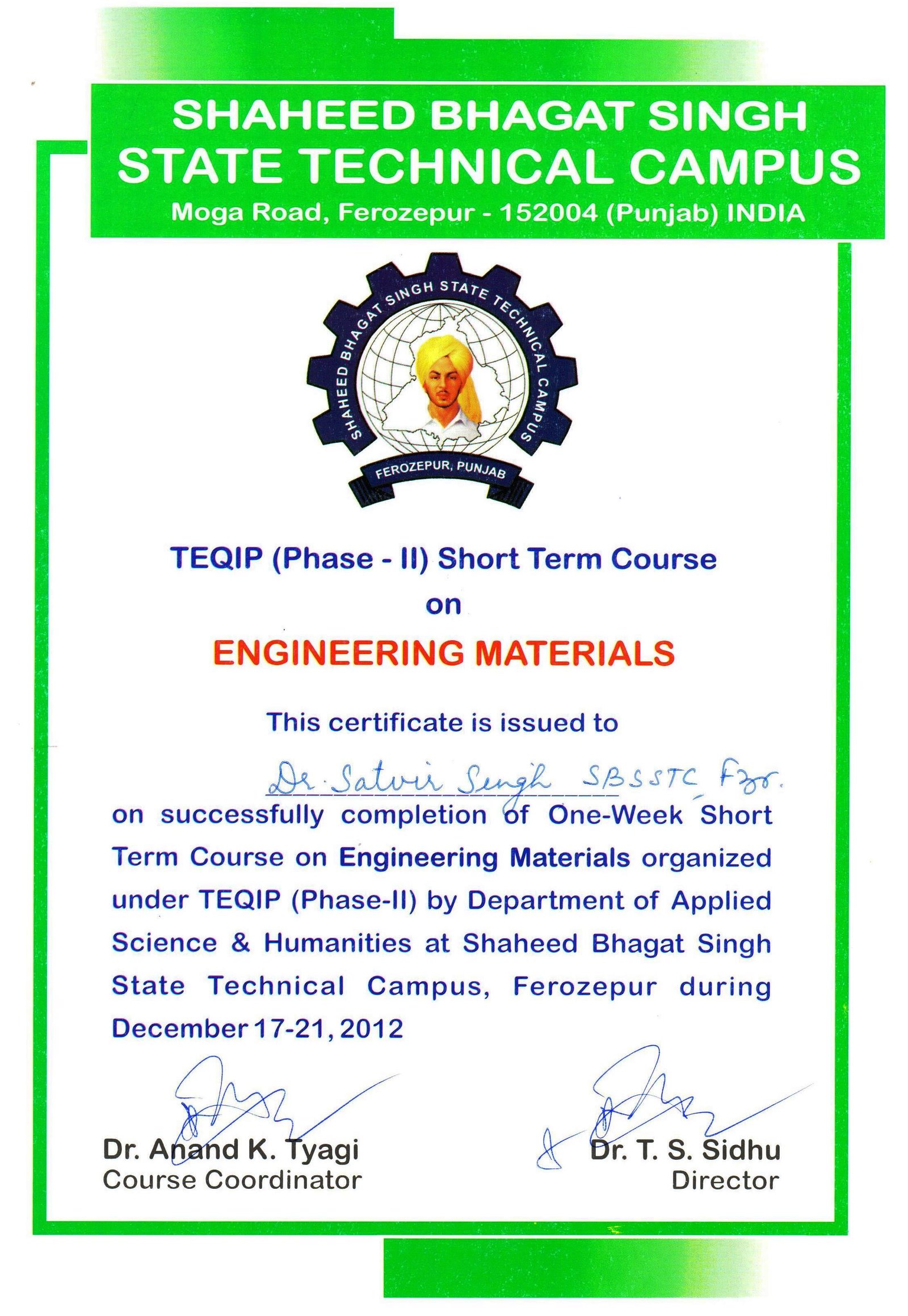 | 8. | Engineering Materials | TEQIP Sponsored STC | SBS College of Engg. & Tech., Ferozepur, PB | Dec, 17-21 2012 |  |
