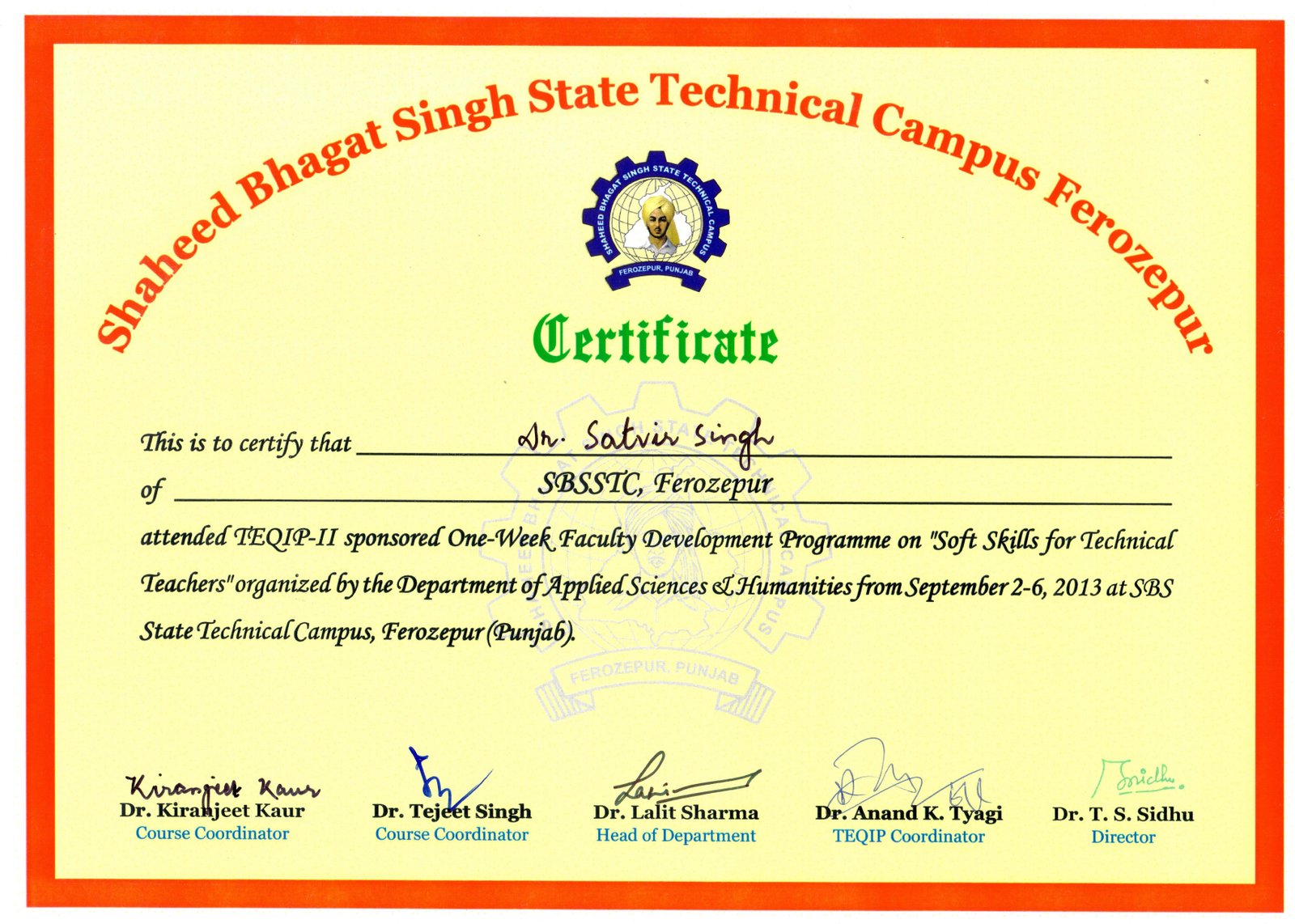 | 7. | Soft Skills for Technical Teachers | TEQIP Sponsored STC | SBS College of Engg. & Tech., Ferozepur, PB | Sep, 02-06 2013 |  |