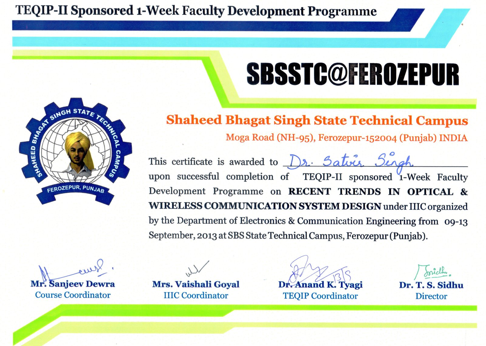 | 6. | Recent Trends in Optical & Wireless Communication System Design | TEQIP Sponsored STC | SBS College of Engg. & Tech., Ferozepur, PB | Sep, 09-13 2013 |  |