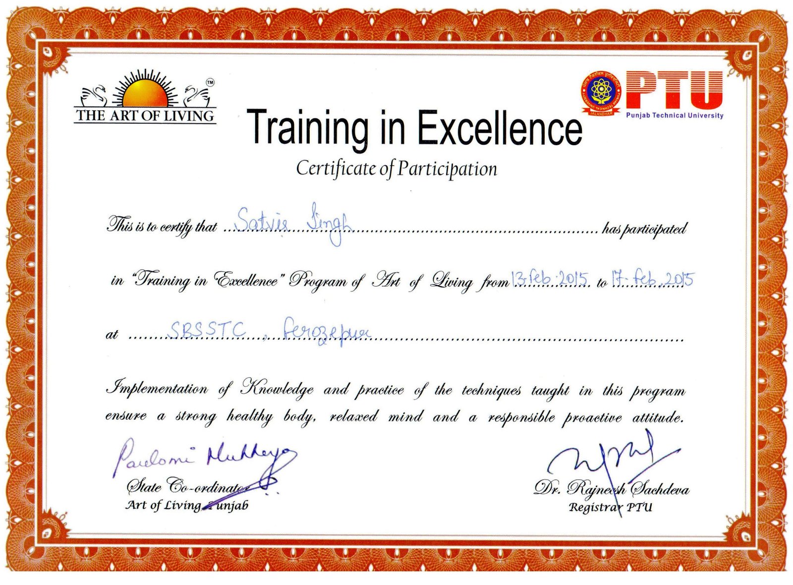 | 3. | Training in Excellence | Art of Living Course | SBS College of Engg. & Tech., Ferozepur, PB | Feb, 13-17 2015 |  |