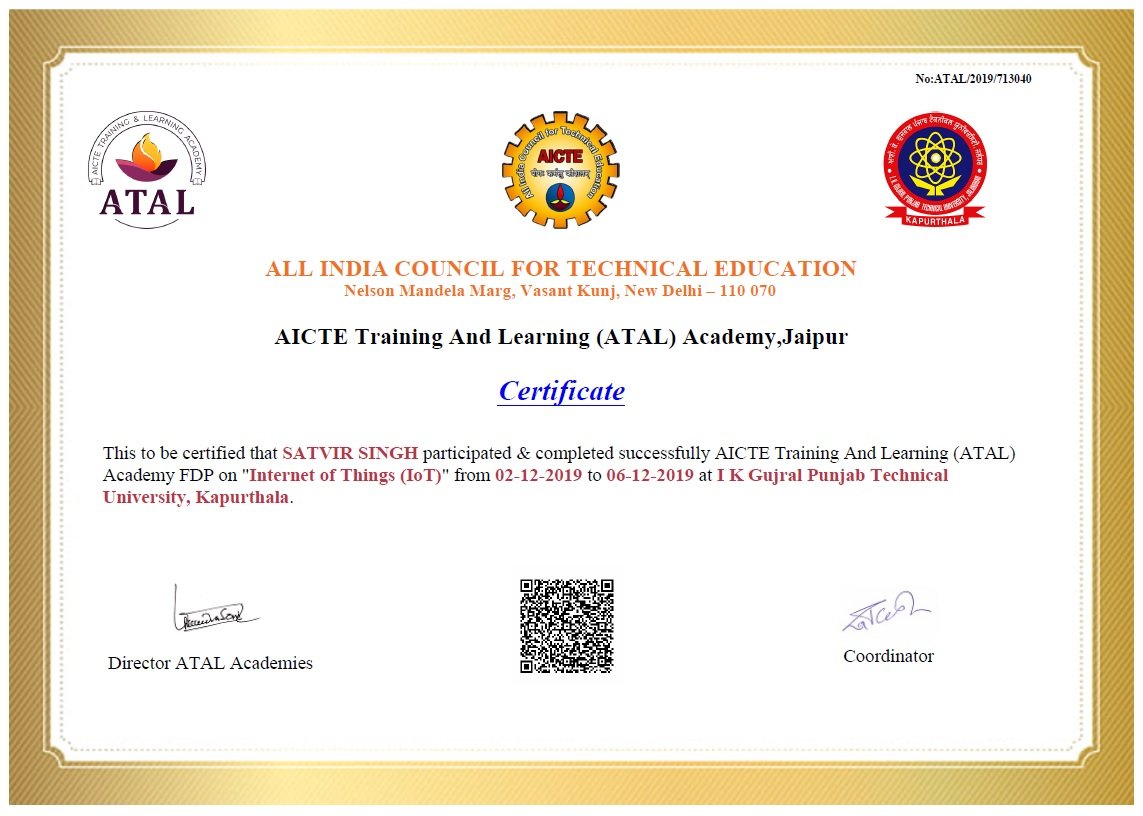 | 1. | Internet of Things (IoT) | AICTE Sponsored FDP | IK Gujral Punjab Technical University, Kapurthala | Dec, 02-06 2019 |  |