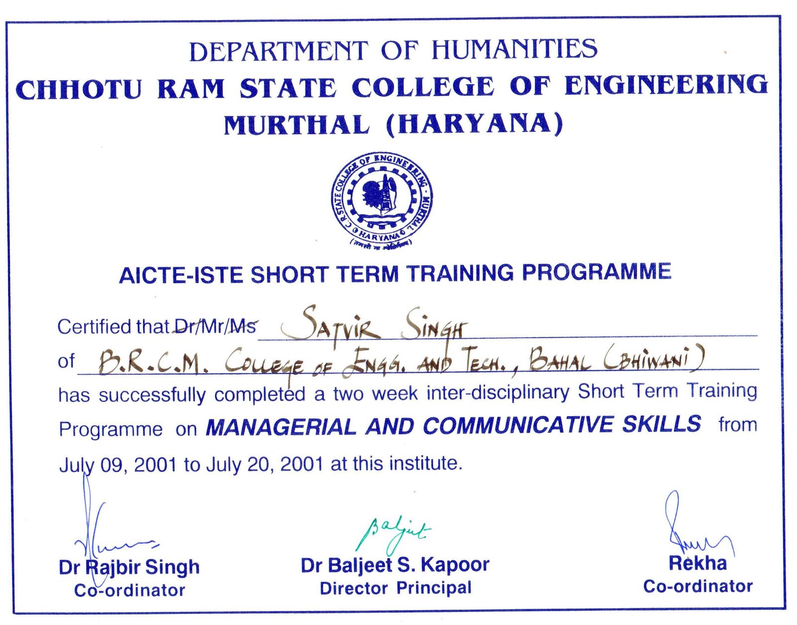 | 7 | Managerial and Communication Skills | AICTE-ISTE Sponsored STTP | CR State College of Engg., Murthal, Sonepat, HR | Jul, 09-20 2001 |  |