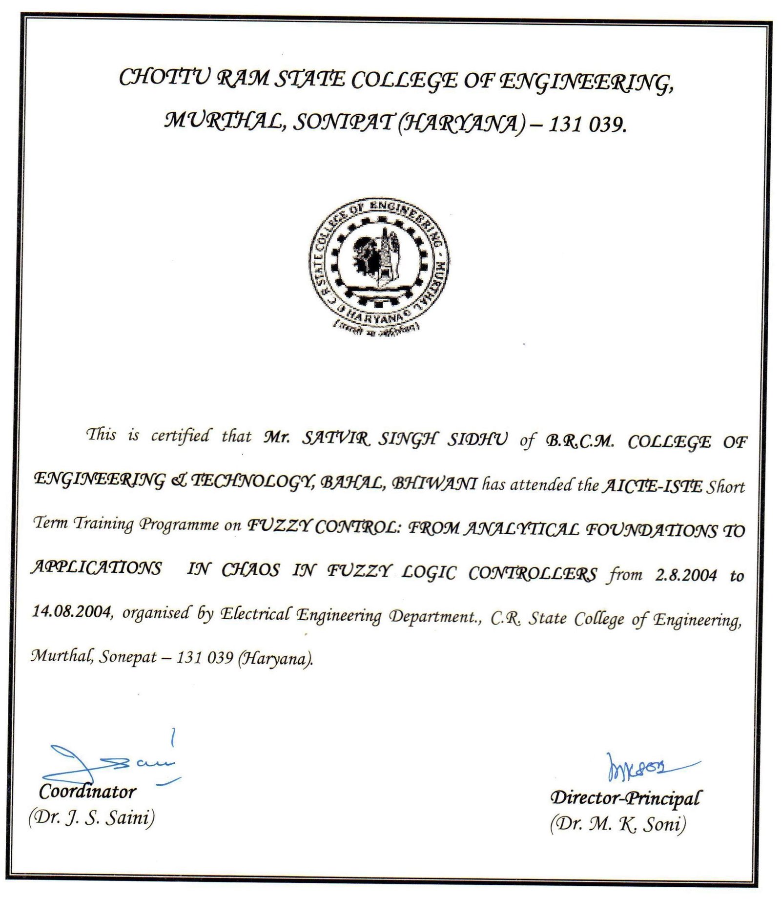 | 6 | Fuzzy Controll: From Analytical Foundations to Applications in Chaos in Fuzzy Logic Controllers | AICTE-ISTE Sponsored STTP | CR State College of Engg., Murthal, Sonepat, HR | Aug, 02-14 2004 |  |