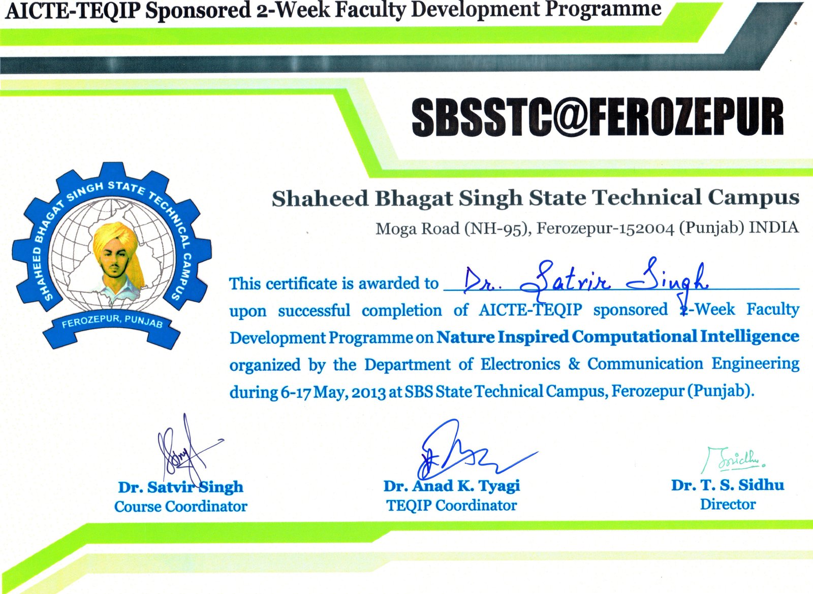 | 2 | Nature Inspired Computational Intelligence | AICTE Sponsored FDP | SBS State Technical Campus, Ferozepur, PB | May, 06-17 2013 |  |